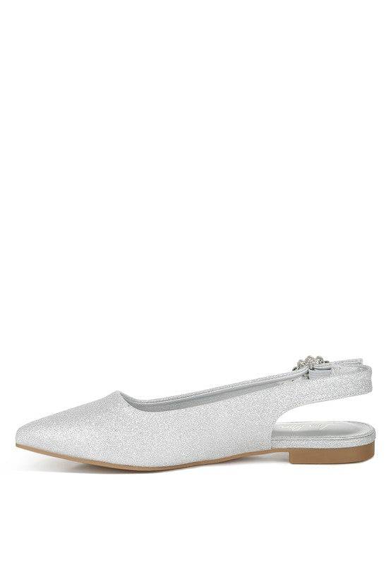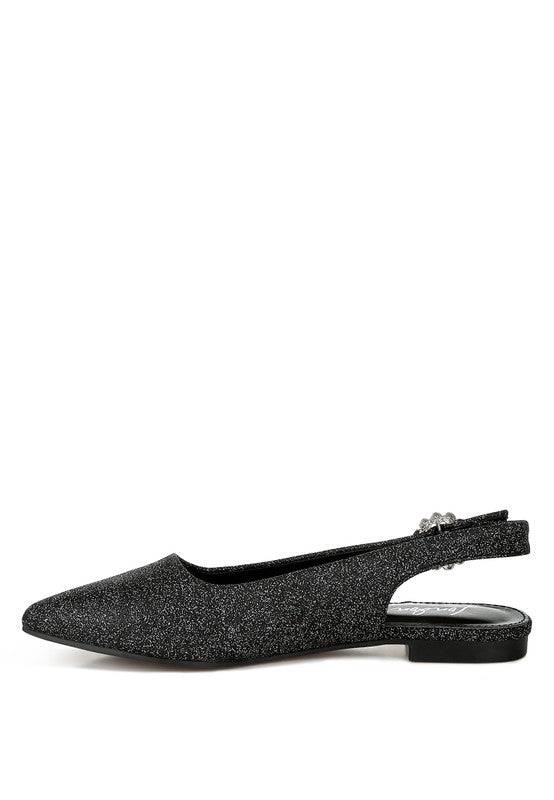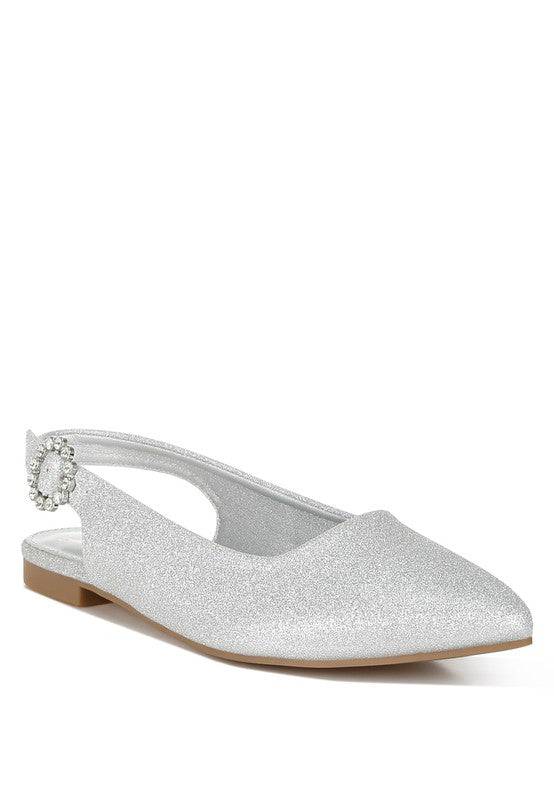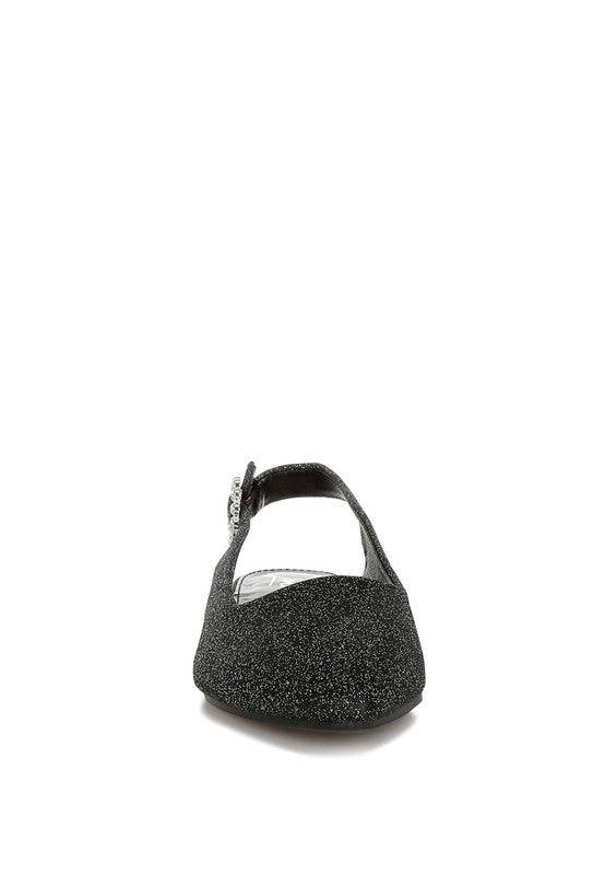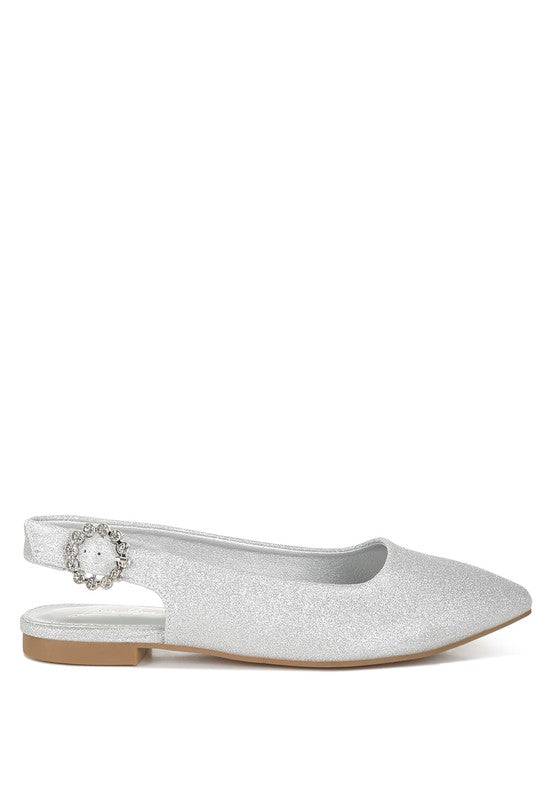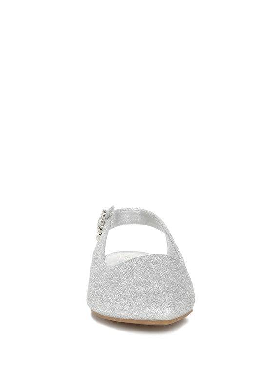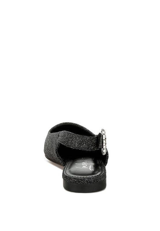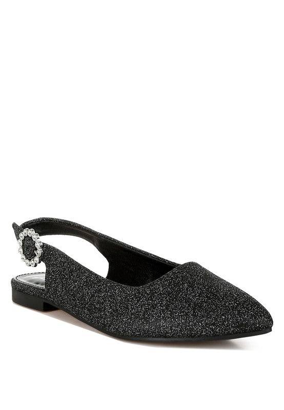 The glitter faux leather slingback sandals are chic and stylish with glitter faux leather upper and pointed toe which gives the pair a trendy and glamorous look. The rhinestones embellished pin buckle & slingback fastening offers a secure fit while the comfortable cushion insoles and flat heels offer relaxed walkability experience.