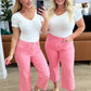 Slip into style and comfort with our Lisa High Rise Control Top Crop Jeans from Judy Blue. Featuring tummy control technology and 4-way stretch, these jeans provide a flattering fit. The wide leg crop and raw hem add trendy details, while the fun pink color will brighten up any outfit. Garment dyed for lasting color.