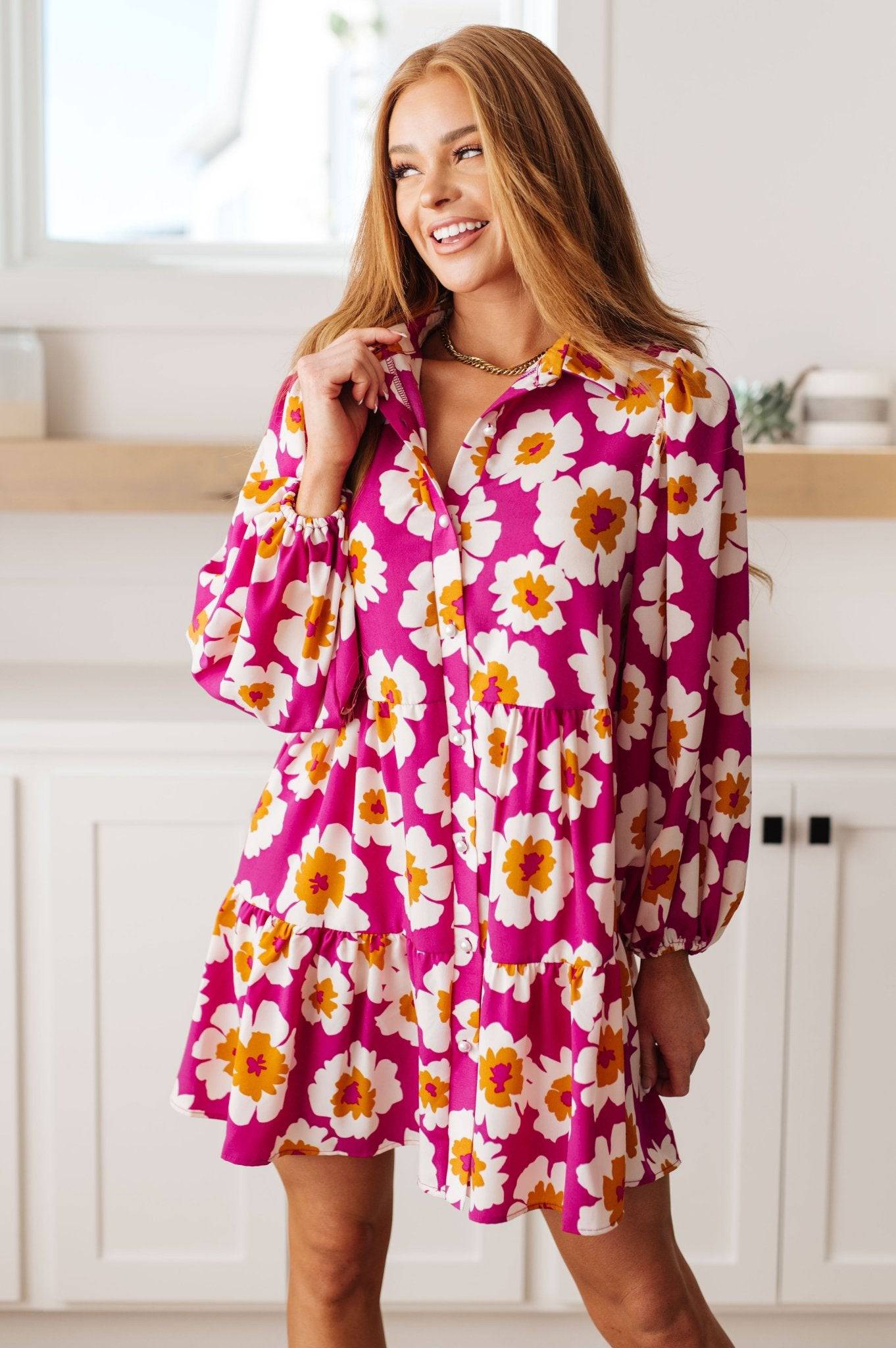 Introducing the Magnificently Mod Floral Shirt Dress - a bold statement that will turn heads! Featuring a vibrant floral print, flattering collared neckline, balloon sleeves, button front, and tiered skirt, you'll feel absolutely stunning in this chic and stylish design. Make a fashion impact today!