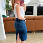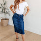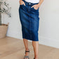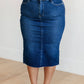 Get ready to rock your denim look with the Marcy High Rise Denim Midi Skirt from Judy Blue! With a flattering high rise fit and a versatile dark wash, this skirt is perfect for any occasion. The 4-way stretch and back vent provide a comfortable and stylish fit, while the raw hem adds a touch of edge. Say goodbye to ill-fitting skirts and hello to the perfect fit!