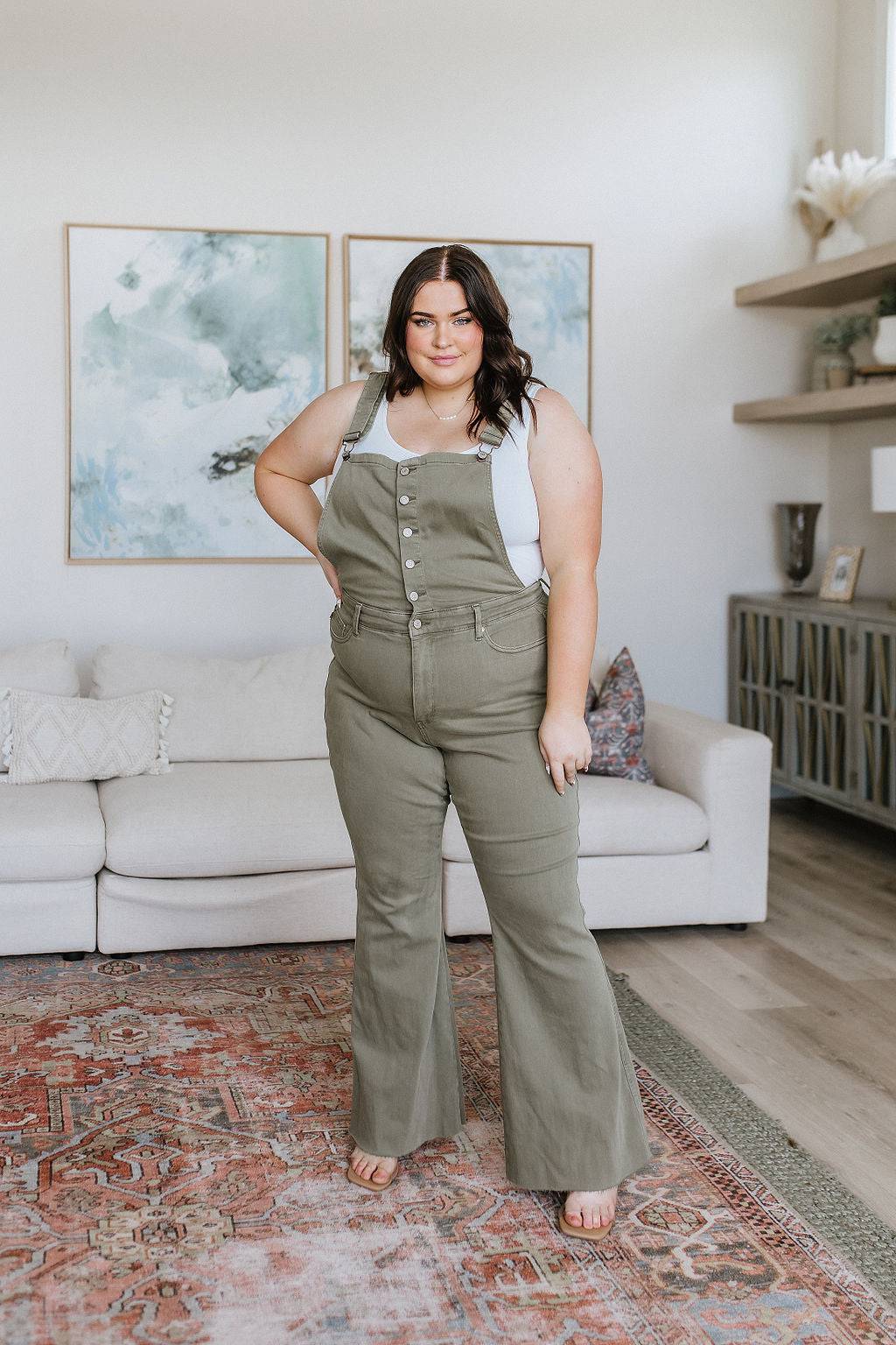 You'll make a statement in these sassy Olivia Control Top Release Hem Overalls! High-rise and featuring tummy control technology, these button-front closure overalls are adjustable and feature a released hem flared silhouette in muted olive green. Slip into a style that's sure to turn heads!
