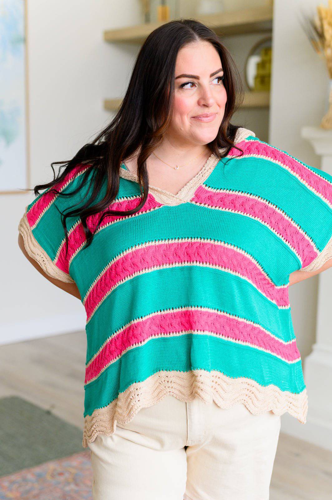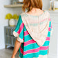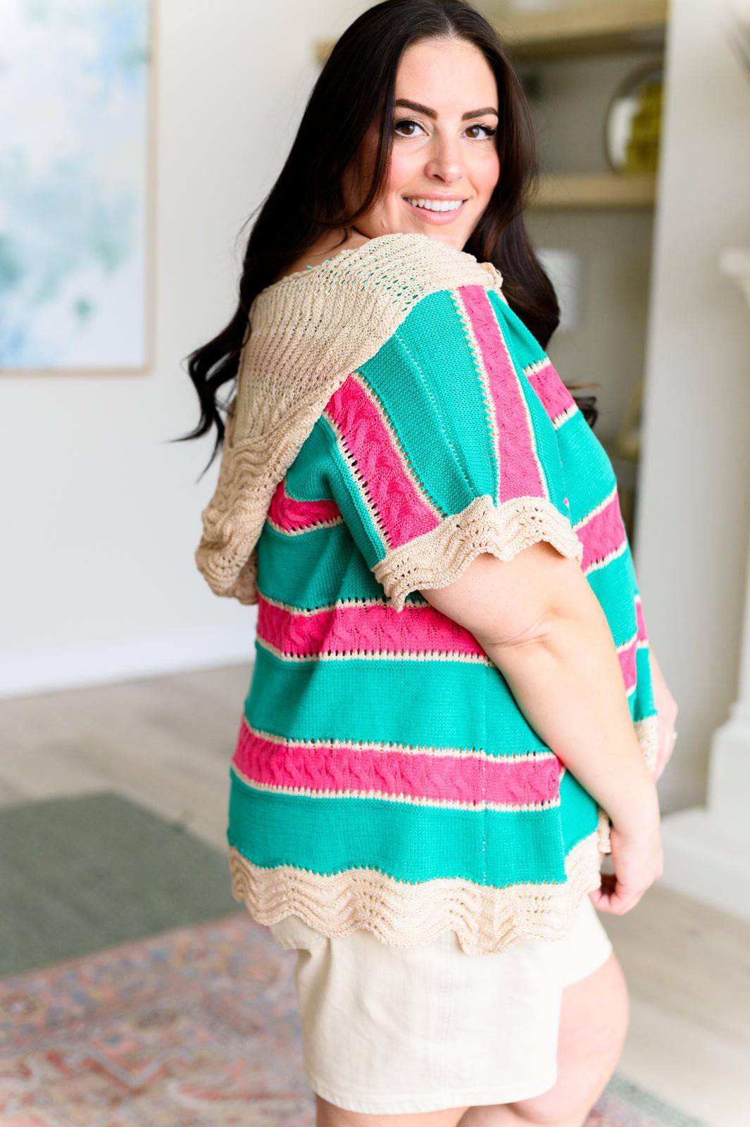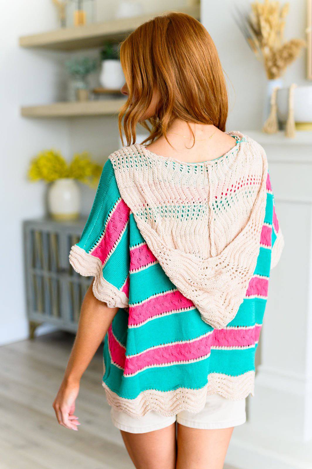 Get into the groove with the Rhythm and Blues Hooded Top. This loose knit top features stripes, a contrast hood, and a scalloped hem and cuff for a relaxed fit. Perfect for a casual yet stylish look.