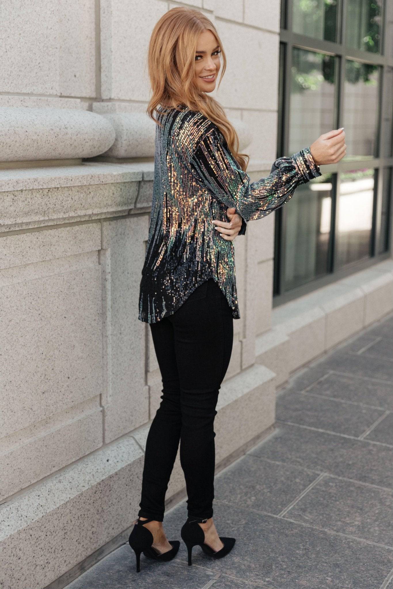 Be glamorous in this Too Glitz to Glam Button Up Shirt. Featuring a sheer sequin mesh, two tone sequins, collared neckline, and button front closure, this top will make you look dazzling. Enjoy the relaxed fit and button sleeve cuffs in style. Shine bright wherever you go!