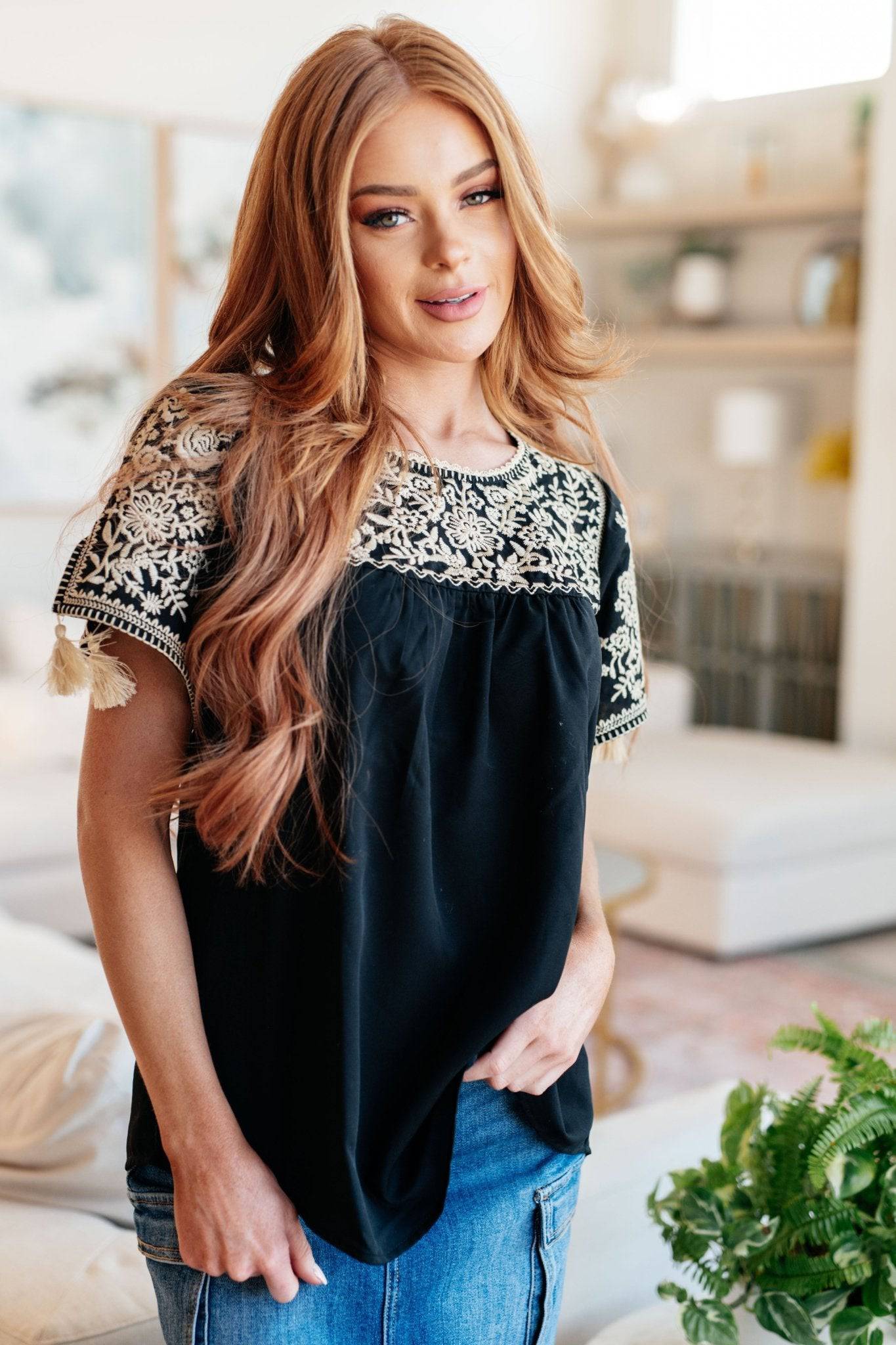 Have a little fun with our Try Again Embroidered Top, an embroidered top made from a lightweight woven fabric. The contrast neckline adds a playful touch, and the tassel details are the cherry on top. It's perfect for a casual day or dressing up for a night out!